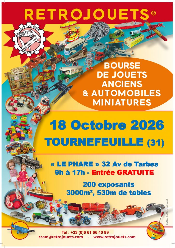 Le CAM sera présent le 18 octobre au salon RETROJOUETS  organisé comme chaque année par le CCAM (Cercle des Collectionneurs d’Automobiles Miniatures de Toulouse) à Tournefeuille – c’est dans la très proche banlieue de Toulouse. Il s’agit de la 94ème édition de Rétrojouets!