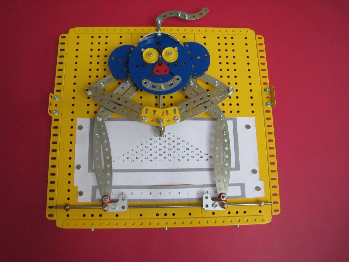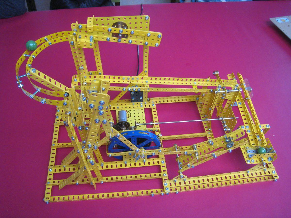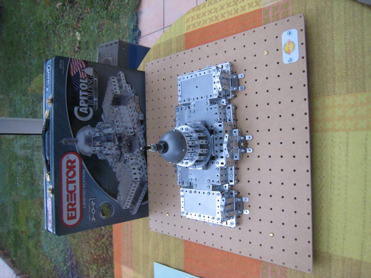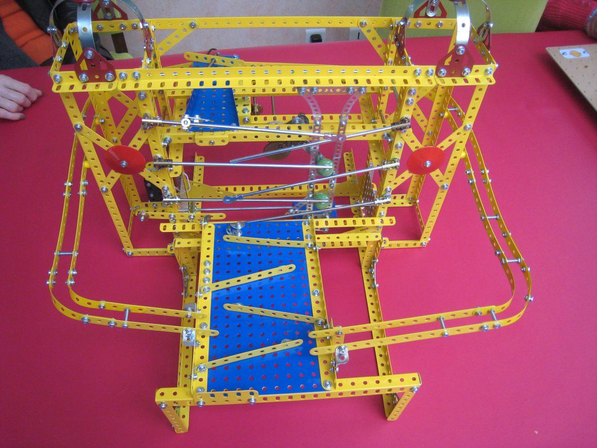 Nous avons pu ensuite examiner les modèles et documents apportés par chacun : le Capitole Erector de Michel (Fig.2, qui sera à Sainte-Consorce), la voiture 25201 (Fig.3,production Meccano actuelle)de Maurice ; une Jeep sur plateaux dentés de diamètre 190 avec deux dentures (Fig.4 et une collection d’Actualités Meccano (Fig.5) de Michel ; le mouvement perpétuel (Fig.6), le monte-en-l’air (Fig.7) et le singe éduqué (Fig.8) de Jean-Louis, un Mecavion (Fig.9) de Patrick ; un modèle en bois Bâtiss (Fig.10, assemblage par tiges métalliques) et une mappemonde en construction (Fig.11) de Jacques.
